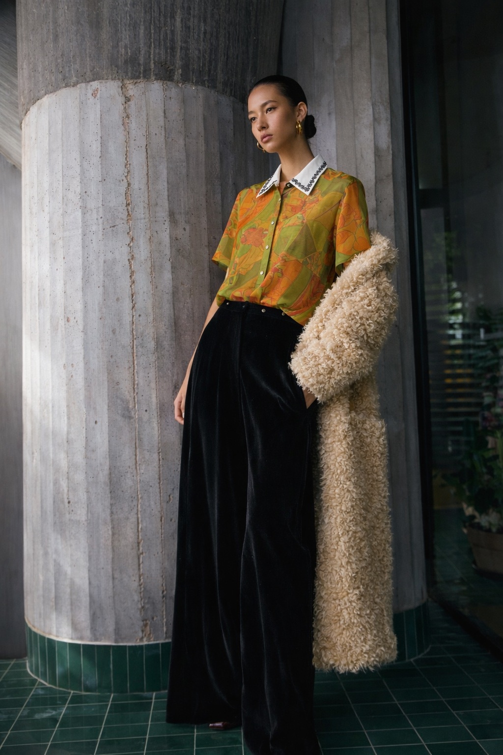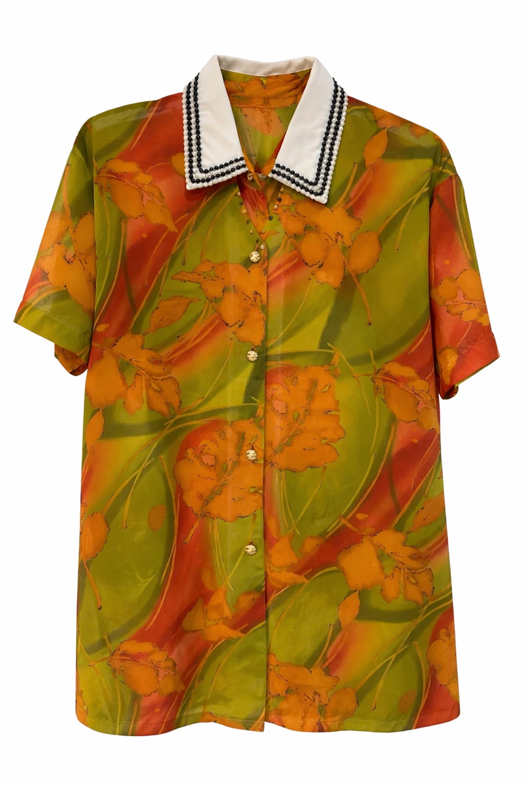 Camisa de material transpirable con adorno en cuello de perlas y caida fluida